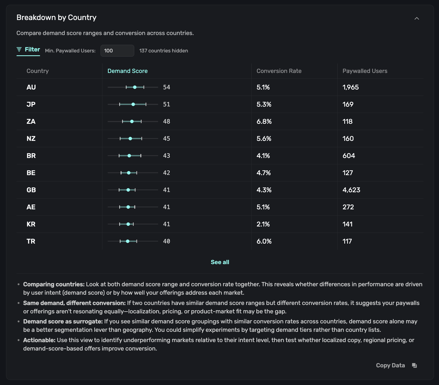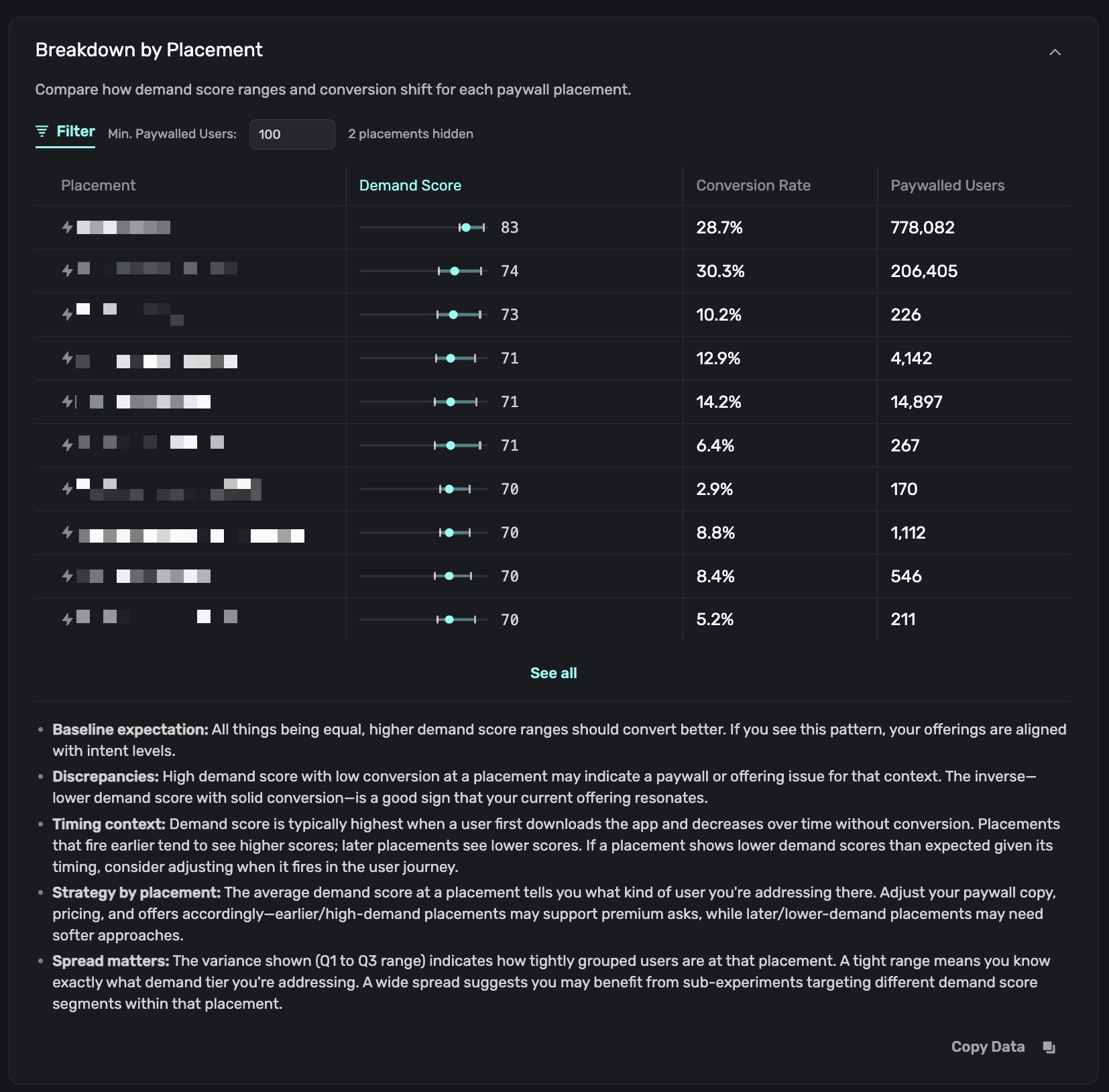 High demand score with low conversion at a placement may indicate a paywall or offer issue. Low demand score with solid conversion is a good sign that your offering resonates even with lower-intent users.